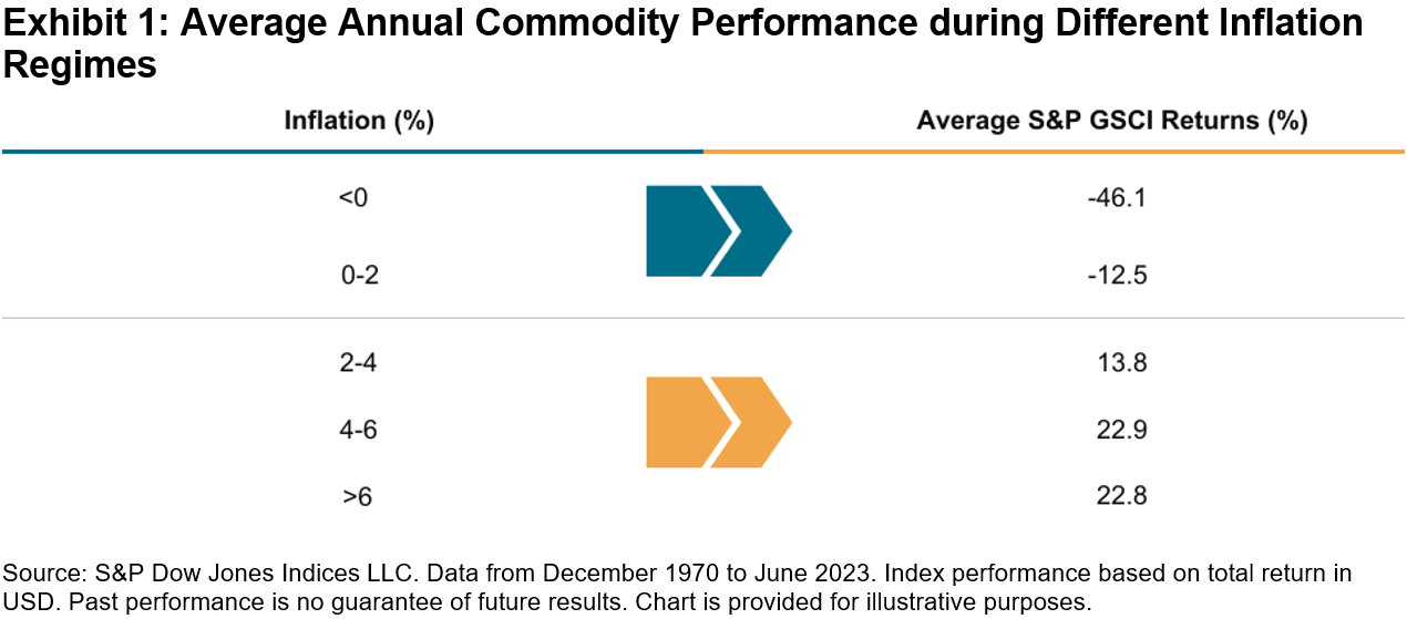 Commodities, as represented by the S&P GSCI, rose over 4% in September and 16% in Q3 2023. This highlighted the potential diversification qualities of this asset class, as equities and fixed income both fell during the month. Commodities’ low correlations to other asset classes can provide a cushion when other higher-allocated asset classes drop during risk-off scenarios as was seen last month. Adding commodities to a strategy tends to dampen overall portfolio risk and drawdowns over time. Historically, during periods of great macroeconomic shifts like we are experiencing now, a diversified portfolio has tended to perform better than more highly concentrated ones. During periods of high and sticky inflation readings, commodities have provided a hedge when other asset classes tend to drop from higher input costs.
