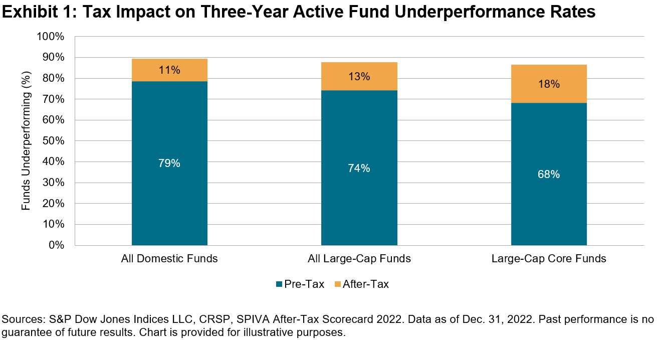 Recently, we published a major extension to the traditional SPIVA library with the first SPIVA After-Tax Scorecard. The report shows that, to put it bluntly: taxes matter. For example, Exhibit 1 (reproduced from the report) shows the impact of taxes on three-year underperformance rates by actively managed broad U.S. equity funds through December 2022.