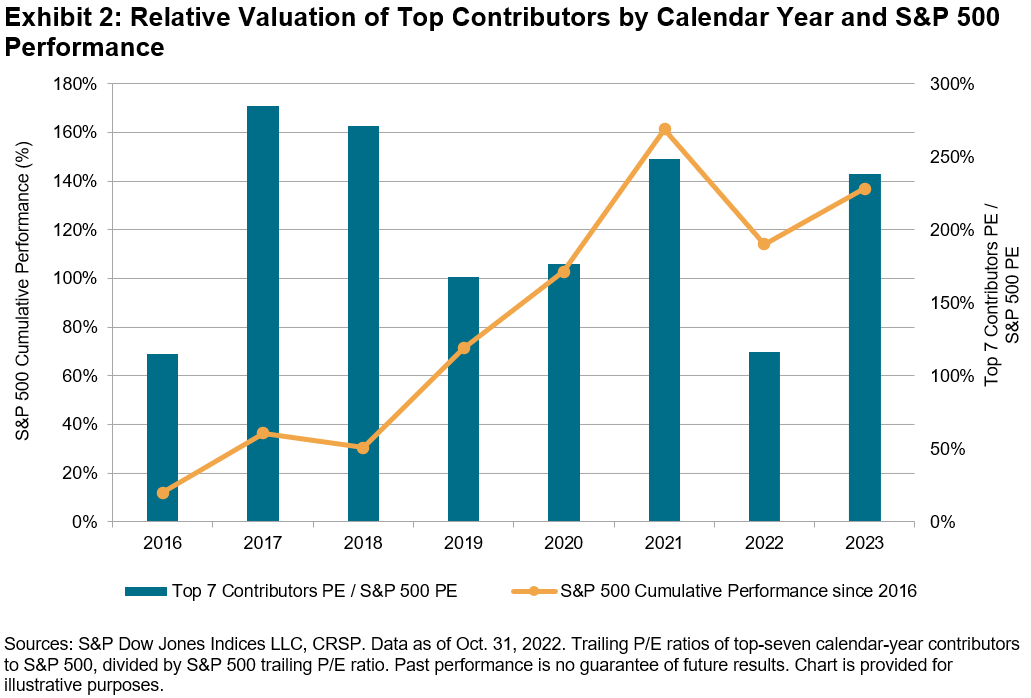 Is it different this time? The current situation is not unusual. In most recent years, the top seven contributors1 ended the year looking relatively expensive (see Exhibit 2). A particularly intriguing comparison is seen in 2017. At that time, the so-called “FAANGs” faced a similar degree of market skepticism, with P/E ratios averaging nearly three times that of the index itself.