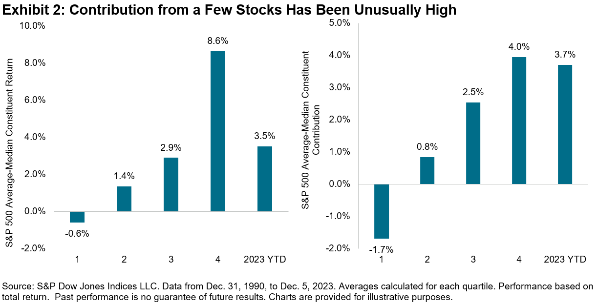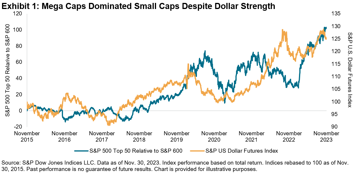 With less than a month left to go to close out the year, it’s a good time to reflect on the highs and lows that market participants have experienced. While the year began with a rocky start due to the Silicon Valley Bank collapse, the market continued to power forward, stumbling in Q3 as 10-year Treasury yields rose to a 15-year high, but recovering with a bang in November, with the S&P 500® up 21% YTD.1 One consequence of rising Treasury yields was the surge in the U.S. dollar, which typically is a currency headwind for mega caps, as U.S. multi-nationals tend to gain most of their revenue from overseas. But that didn’t hamper the tear that mega caps were on this year, as Exhibit 1 illustrates, with the S&P 500 Top 50 outpacing the S&P 600® by 28% YTD. While we recently saw a pullback in 10-year yields along with the dollar, with the S&P U.S. Dollar Futures Index down 2% in November, if that trend continues, that could potentially be a further benefit to mega-cap strength.