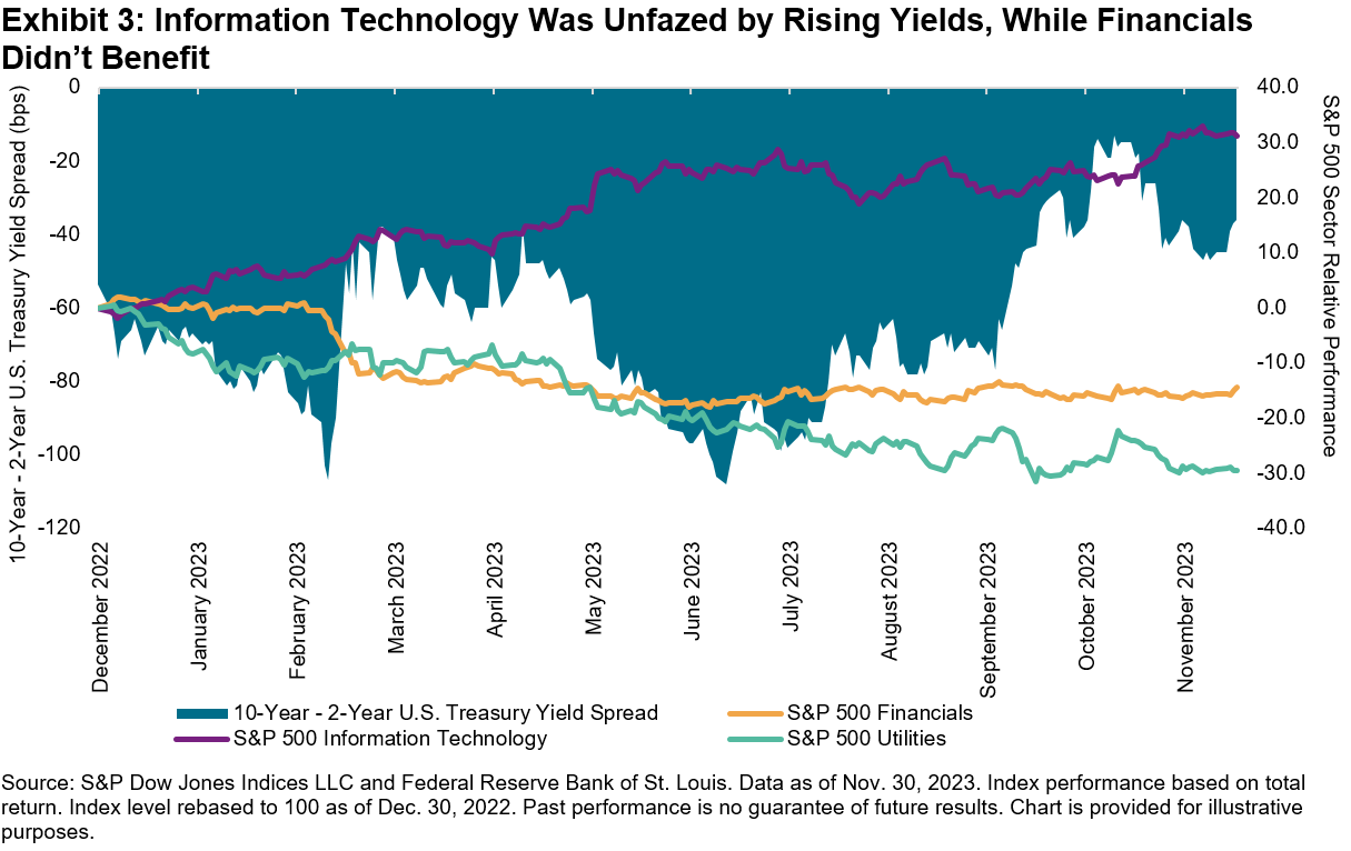 Returning to the ascent of 10-year Treasury yields, the rise was not limited to the long end of the curve, with a significant climb in short-term Treasury yields on the back of Fed rate hikes to combat inflation. But as 10-year yields picked up steam, the inverted yield curve began to disinvert. At a sector level, Exhibit 3 shows that the momentum in Information Technology has continued despite the sector’s traditional sensitivity to higher rates, while Utilities, traditionally more bond-like in nature, is unsurprisingly the worst sectoral performer YTD. What is surprising is that while Financials should benefit from the disinversion of the yield curve, which can improve banks’ net interest margins, the sector has not managed to fully recover post the Silicon Valley Bank tumult.