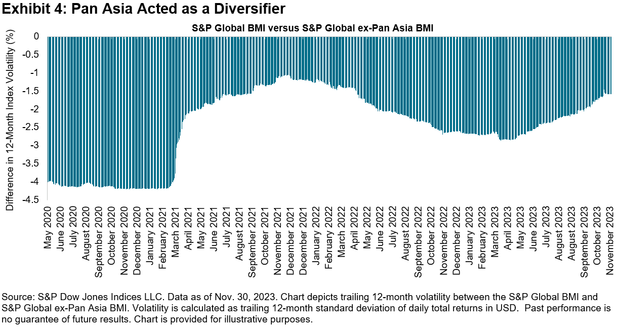 In addition to spectacular equity performance, we witnessed a strong recovery in fixed income compared to last year’s abysmal performance, with the iBoxx Liquid Investment Grade up 8% in November, its best monthly return since December 2008. But while absolute performance has been rosy, risk-adjusted performance can be more challenging given continued positive correlations between equities and bonds, a natural outcome of gains across both asset classes. Meanwhile, despite China’s economic and real estate woes, with the S&P China 500 down 14% in USD terms year-to-date, Asian markets offered some solace, as we see in Exhibit 4, where a consistent negative spread in trailing 12-month volatility between the S&P Global BMI and S&P Global ex-Pan Asia BMI indicates Pan Asia has acted as a diversifier.