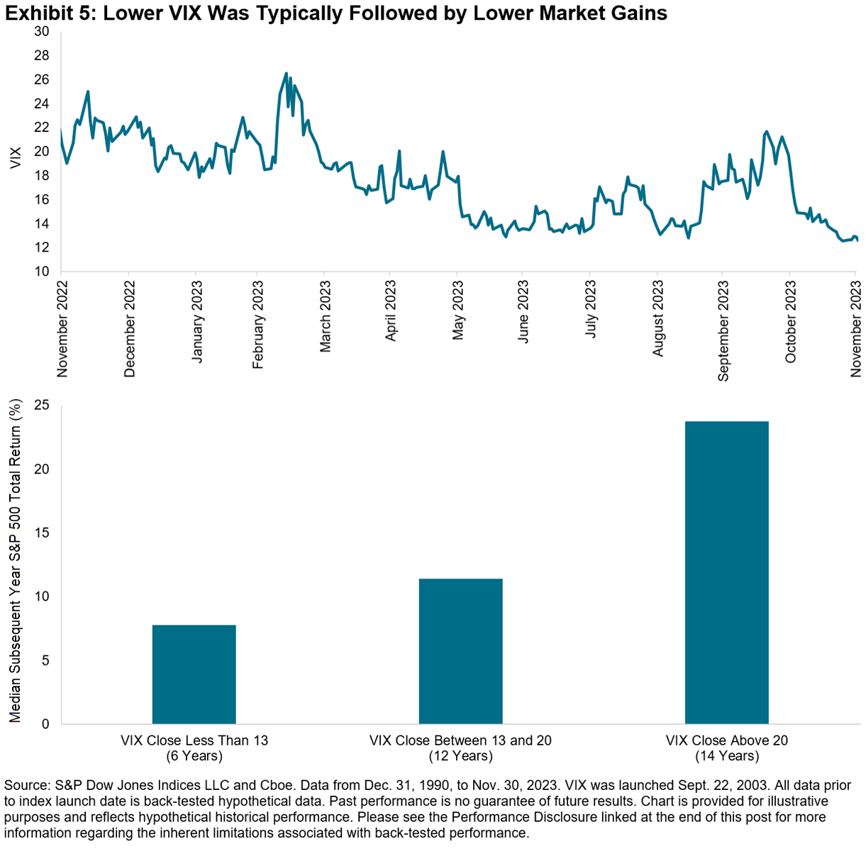 Putting risk into context, despite geopolitical tensions coupled with lingering inflation and recession concerns, Exhibit 5 shows that the market has been at ease, with the VIX® trending downward in the past 12 months, ending November below the 13 handle. But what signal has low equity implied volatility given for future equity returns historically? We rank the same years in our database by VIX and divide them into three buckets based on a VIX level at year-end of less than 13, between 13 and 20, and above 20. Historically, we see a linear relationship between the year-end level of VIX and median subsequent year S&P 500 returns, indicating that, on average, years ending with higher implied volatility tended to be followed by higher returns.