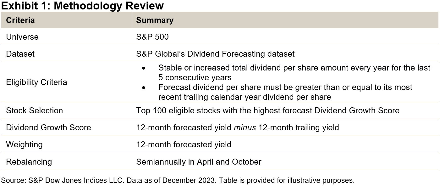 As the leading dividend index provider, S&P DJI is constantly looking for new approaches and methodologies to bring novel ideas to the market. Our recently launched S&P 500® High Dividend Growth Index is a prime example of this innovative thinking, as it incorporates a forward-looking assessment into its methodology. This index tracks companies in the S&P 500 that have not only offered consistent or growing dividends in the past but also have the highest forecast dividend yield growth. In doing so, constituents are selected based on what dividend they are expected to pay instead of being assessed solely on what they have paid in the past.