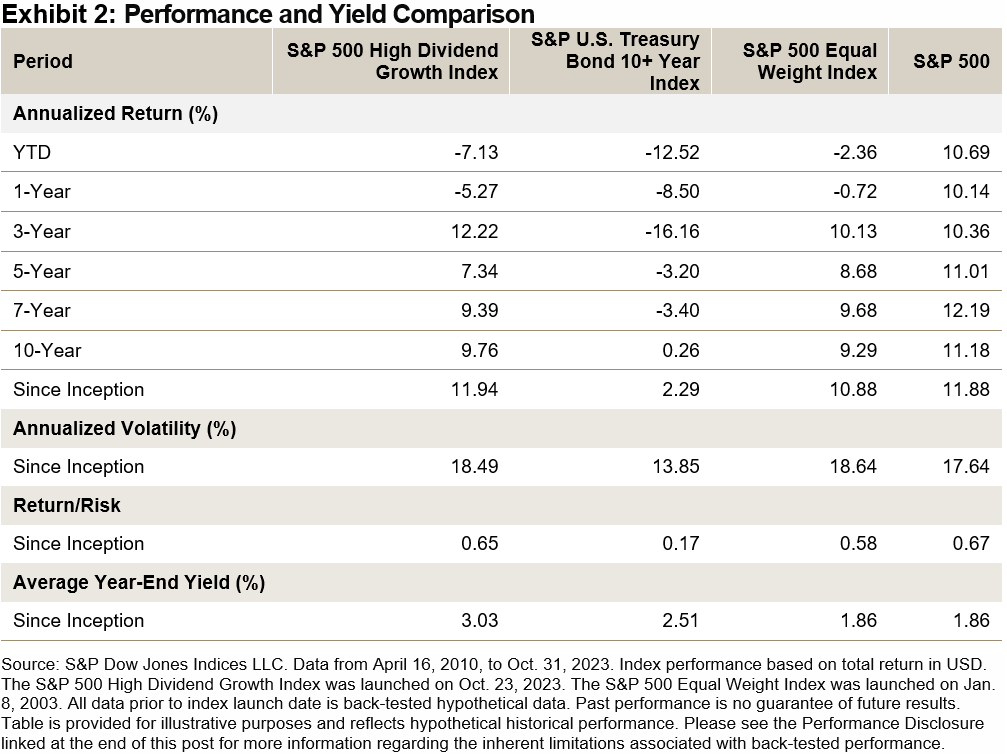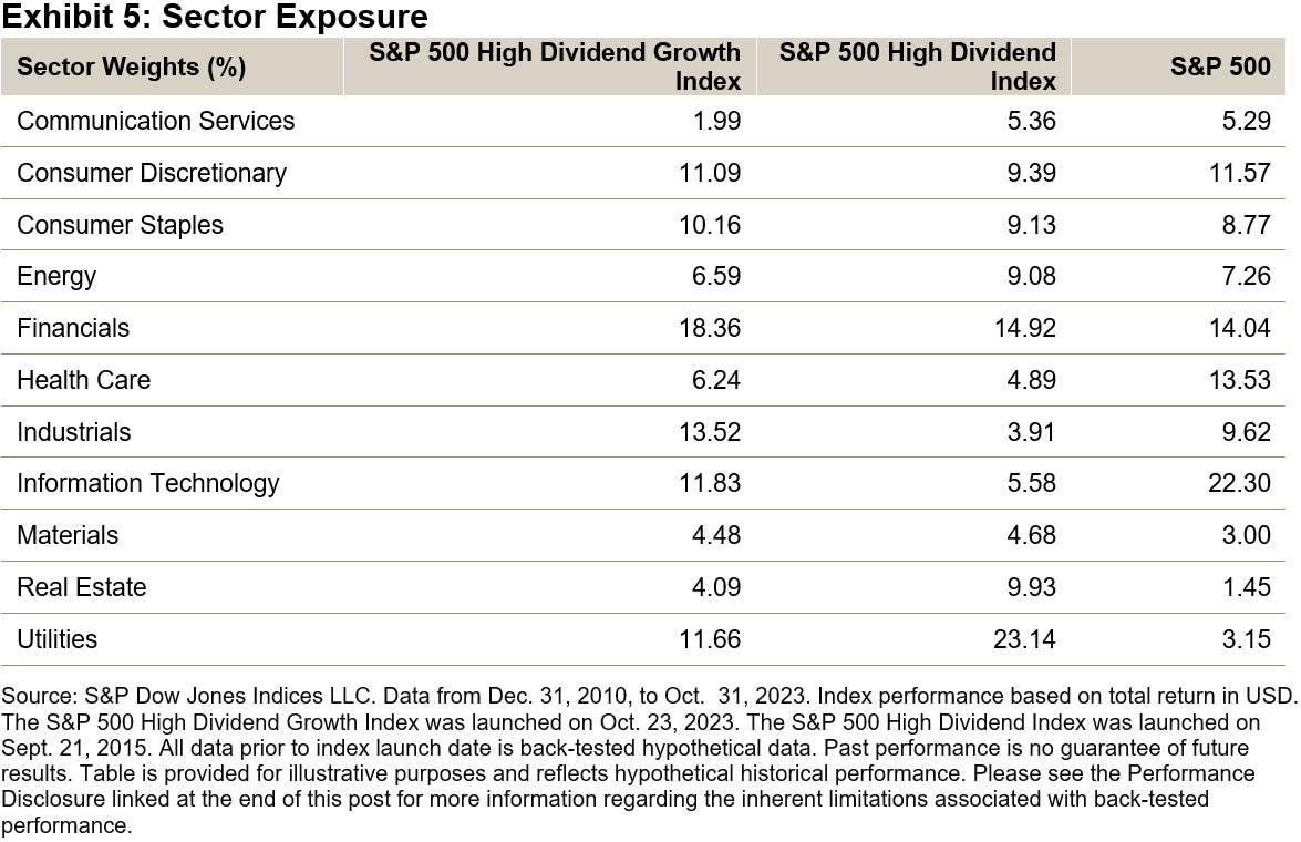 From a sector perspective, the S&P 500 High Dividend Growth Index had lower sector weights in Utilities (-11.5%) and Real Estate (-5.8%), while having higher sector weights in Industrials (9.6%) and Information Technology (6.3%) than the S&P 500 High Dividend Index (see Exhibit 5).
