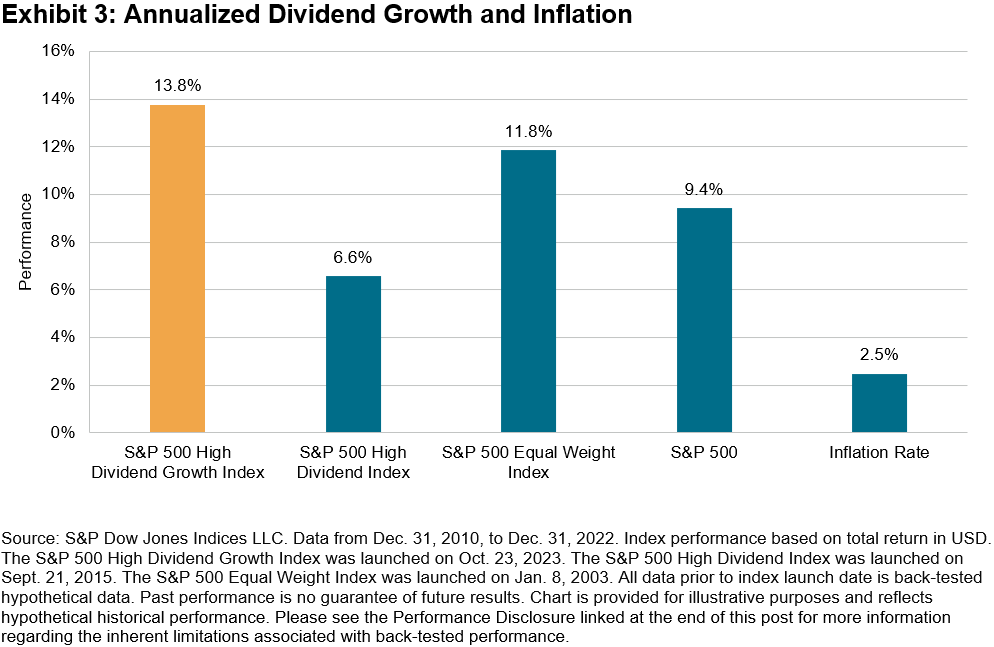 Impressively, for a dividend strategy offering a high yield, the index also has a high annualized dividend growth rate. From 2010 to 2022, the S&P 500 High Dividend Growth Index grew its dividend at an annual rate of 13.8% (see Exhibit 3). This outpaces the long-term U.S. inflation rate, even with the recent spike in inflation over the last few years.