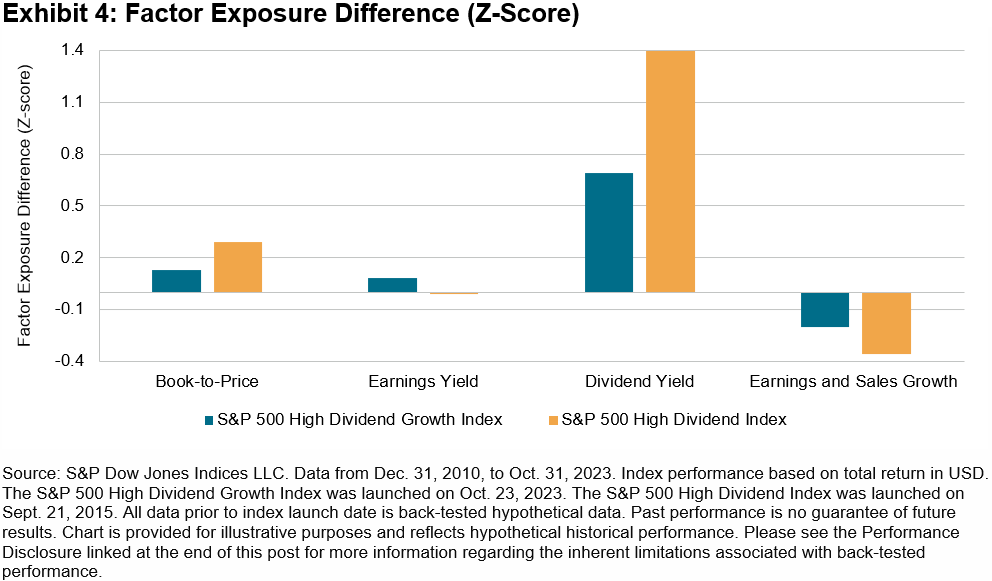 Exhibit 4 shows the factor exposure difference between the S&P 500 High Dividend Growth Index and S&P 500 High Dividend Index in terms of Axioma Risk Model Factor Z-scores. The S&P 500 High Dividend Growth Index demonstrated less value tilt and had lower dividend yield than the S&P 500 High Dividend Index.