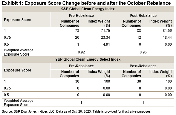 Both the S&P Global Clean Energy Index and the S&P Global Clean Energy Select Index went through a semiannual rebalance on Oct. 20, 2023. In the index methodology, we assign companies to four buckets of exposure scores from 0 to 1 with an increment of 0.25 to measure their purity of exposure to the clean energy business. Exhibit 1 shows the change in exposure before and after the October rebalance. We can see that for the S&P Global Clean Energy Index, post rebalancing, we have 10 more companies with an exposure score of 1 being added to the index. The weighted average exposure score of the index improved from 0.92 to 0.95. This shows the effect of rebalancing to improve the purity of index exposure to clean energy companies. The S&P Global Clean Energy Select Index, on the other hand, selects 30 companies with an exposure score of 1 listed in the developed market exchanges.