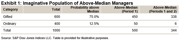 For example: Suppose we assume that 60% of all managers are “gifted” and 40% are “ordinary,” that a gifted manager has a 75% probability of achieving above-median results, and that an ordinary manager has a 12.5% chance of doing the same. Exhibit 1 shows some implications of these assumptions for a 1000-manager universe.