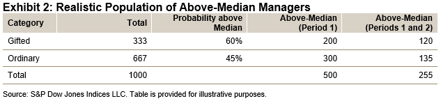 The good news is that using Exhibit 2’s assumptions, 51% (255/500) of period 1’s above-median managers should repeat that performance in period 2. Although we don’t often see results that good, 51% persistence is not unheard of, and so Exhibit 2 is at least a somewhat plausible model of reality.