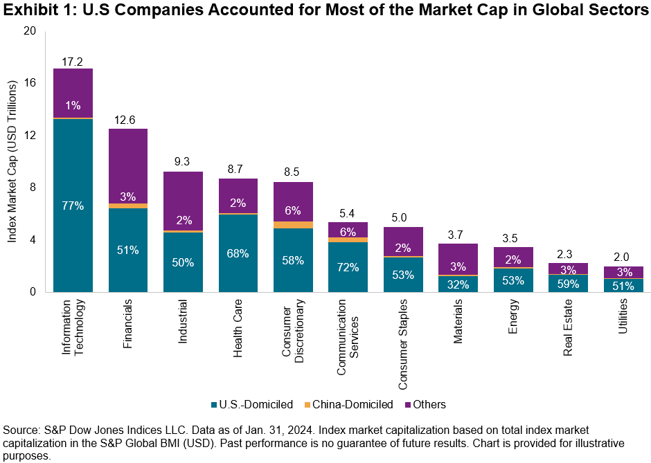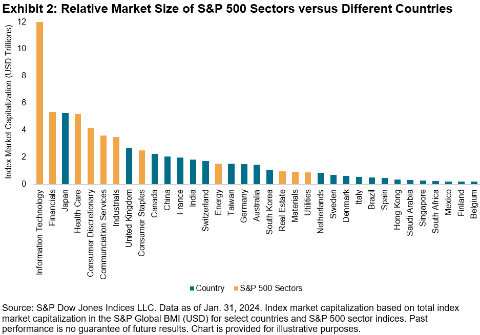 Moreover, the breadth and depth of the U.S. equities market means that the size of S&P 500 sectors is comparable to many countries. For instance, as of Jan. 31, 2024, the market capitalization of the S&P 500 Information Technology (USD 12 trillion) was second only to the entire U.S. market in the S&P Global BMI (USD 50 trillion). The S&P 500 Financials and S&P 500 Health Care are comparable in size to the Japanese market. The size of U.S. sector segments means that expressing views through a sector lens could have presented similar opportunities—as measured by market size or capacity-adjusted dispersion—as expressing views through a country lens, historically.