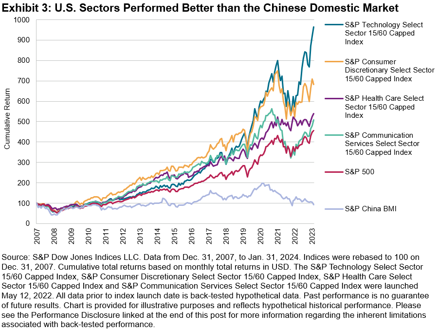 In recent years, China has grappled with a slower-than-expected recovery from the COVID-19 pandemic and encountered various internal and external challenges. During the same period, however, certain U.S. sectors showcased remarkable resilience and delivered substantial returns. For example, the S&P Communication Services Select Sector 15/60 Capped Index, which experienced a larger decline than the S&P China BMI in 2022 (-34% versus -22%, respectively), rebounded with a 42% return in 2023, while the S&P China BMI saw an additional 10% drop.