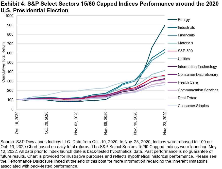 Historical evidence highlights the potential value of utilizing sectors to express views on the U.S. Presidential election, as investors often factor in the anticipated impact of candidates’ policies on various market segments. The 2016 election saw a significant divergence between the best- and worst-performing sectors, emphasizing the potential value of expressing views through a sector lens. More recently, sector performance around the 2020 election was influenced by several dynamics, including surging oil prices which helped Energy companies to outperform (see Exhibit 4).