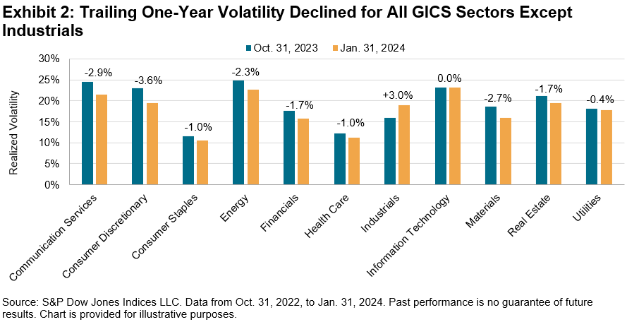 As Exhibit 2 shows, trailing one-year volatility decreased for all GICS sectors except for Industrials as of Jan. 31, 2024, versus Oct. 31, 2023. The widespread decline in volatility continued the trend that took place throughout most of 2023. Measured in absolute terms, the sectors with the largest declines in volatility were Consumer Discretionary, Communication Services and Materials, which dropped by 3.6%, 2.9% and 2.7%, respectively. Industrials was the only sector with an increase in volatility, rising from 15.9% to 19.0%.
