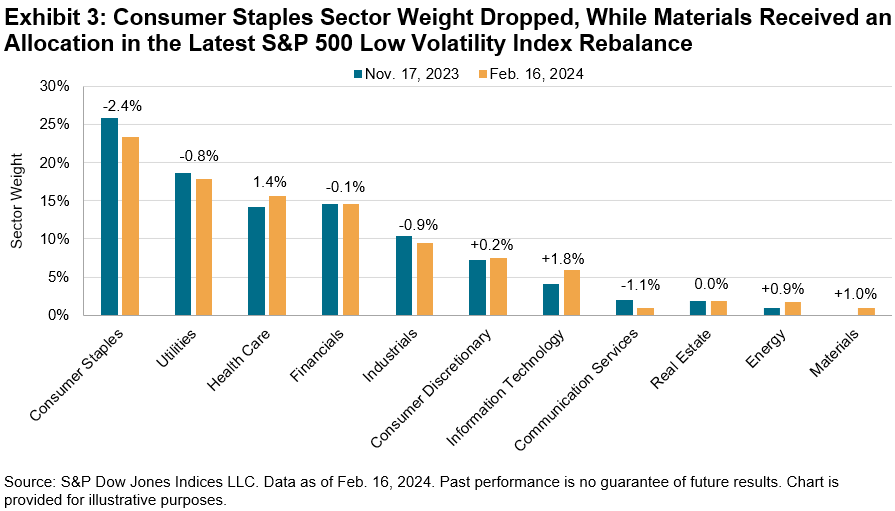 Amid the overall decrease in volatility, the S&P 500 Low Volatility Index’s latest rebalance brought changes to sector weightings, although the changes were more muted than recent rebalances. Consumer Staples lost 2.4%, the most of any sector, although it retained its position as the highest-weighted sector, at 23.4%. The largest recipients were Information Technology and Health Care, receiving 1.8% and 1.4%, respectively. Materials received a 1.0% allocation, resulting in all 11 GICS sectors now being represented in the S&P 500 Low Volatility Index. The latest rebalance was effective after the market close on Feb. 16, 2024.