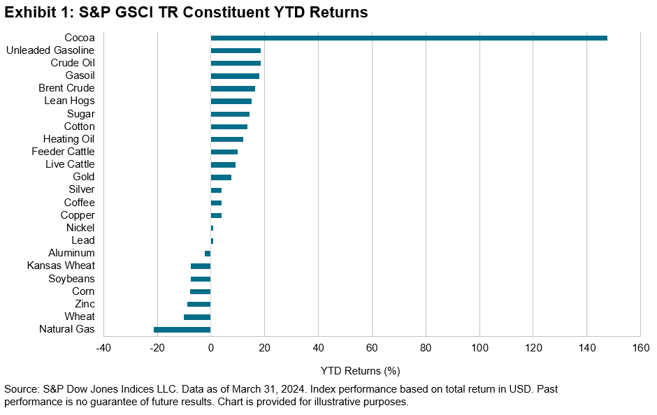 Inflation presented a direct hit to consumers at the pump, with gasoline futures moving in near lockstep with oil. Petrol prices from crude, gasoil and gasoline rose 16%, 17% and 18% YTD, respectively. The S&P GSCI All Crude, which makes up over 42% of the broad index, is trading at a six-month high on the back of production cuts by OPEC+. These cuts offset yet another record in U.S. crude oil production, according to the Energy Information Administration. Strong petroleum performance led the S&P GSCI to an 10.4% YTD return, a solid start that perhaps is overshadowed only by the S&P 500® at all-time highs. At S&P Global’s recent CERAWeek event, leading commodity market participants engaged in discussions ranging from energy transition to geopolitics. Nickel is at the center of both, due to its importance as a primary metal for electric vehicles. Indonesia accounts for over half of nickel production and is pushing for an OPEC+ style cartel to manage future supply. The S&P GSCI Nickel continues to lag the broader commodity market, down 6.7% for the month and 33% lower over the past year.