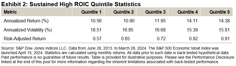 Exhibit 2 shows that long-term annualized returns steadily increase for each quintile, with quintile 5 providing an annualized return of 14.38% versus 10.56% for quintile 1. Conceptually, this makes sense as companies that can sustainably earn higher ROICs should grow their earnings and intrinsic value at a faster rate over the long term. Moreover, volatility tends to also decrease for higher ranking quintiles, with quintile 5 exhibiting a 15.81% annualized volatility versus 18.51% for quintile 1.