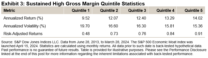 Like Exhibit 2, Exhibit 3 shows that long-term annualized returns steadily increase based on companies’ gross margin. Furthermore, due to volatility diminishing for companies with higher sustained gross margins, the risk-adjusted return significantly improved from 0.48 to 0.91 for quintiles 1 and 5, respectively, representing a substantial 90% improvement.