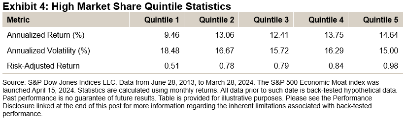 Although Exhibit 4 does not show perfect sequential improvement in quintile performance like Exhibits 2 and 3, the trend remains evident that companies with high market share significantly outperform those with low market share. In addition to posting the highest absolute return of 14.64%, quintile 5 also exhibited the lowest annualized volatility (15.00%), translating to an impressive 0.98 risk-adjusted return.