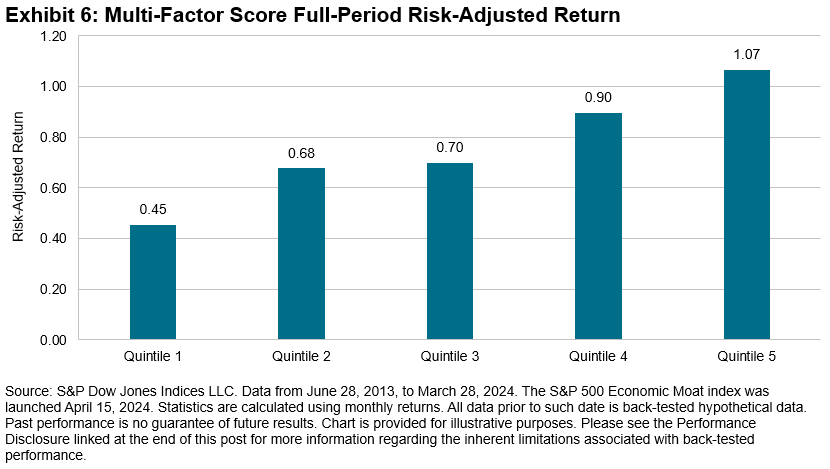 In addition to having a solid economic rationale, we believe that metric selection should also be based on empirical research. For Exhibits 2-4, we tested each metric on a standalone basis by dividing S&P 500 constituents into quintiles based on their metric z-score and equal weighting them, with quintiles 1 and 5 being the lowest and highest ranked quintiles, respectively. Exhibit 5 shows the results after combining the three metrics into a multi-factor score. Like the S&P 500 Economic Moat Index, the quintiles are rebalanced semiannually in June and December. Performance is calculated using daily returns from June 21, 2013, to March 31, 2024.