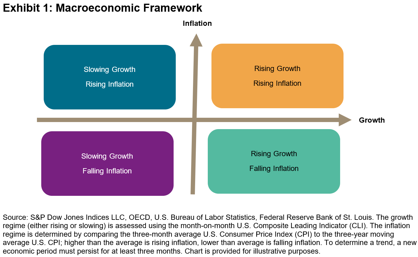 Our recent blog highlights that the dividend growth rate for the S&P High Yield Dividend Aristocrats has exceeded inflation over the long term (2000-2023). In this blog, we extend this analysis to look at how the index has performed across past macroeconomic cycles. Our framework identifies four economic regimes that are determined by the strength and direction of both growth and inflation (see Exhibit 1).