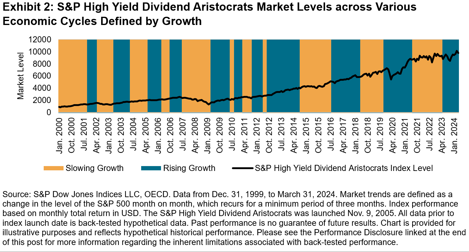 In periods of slowing growth when markets are falling, the downside protection characteristics of the S&P High Yield Dividend Aristocrats tend to be favorable. The index methodology encompasses strict dividend qualification criteria, which leads the index to track higher quality companies that may offer resilience at this time.