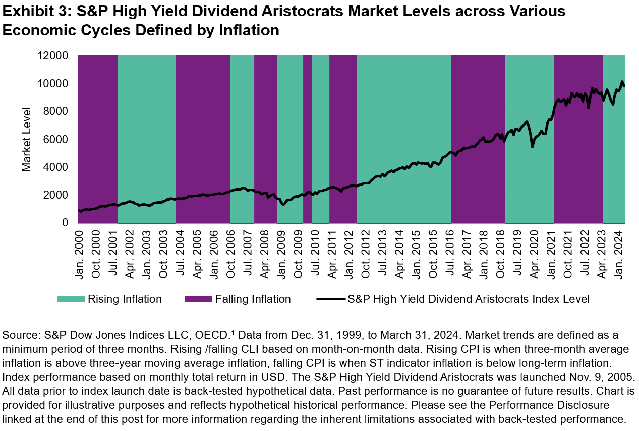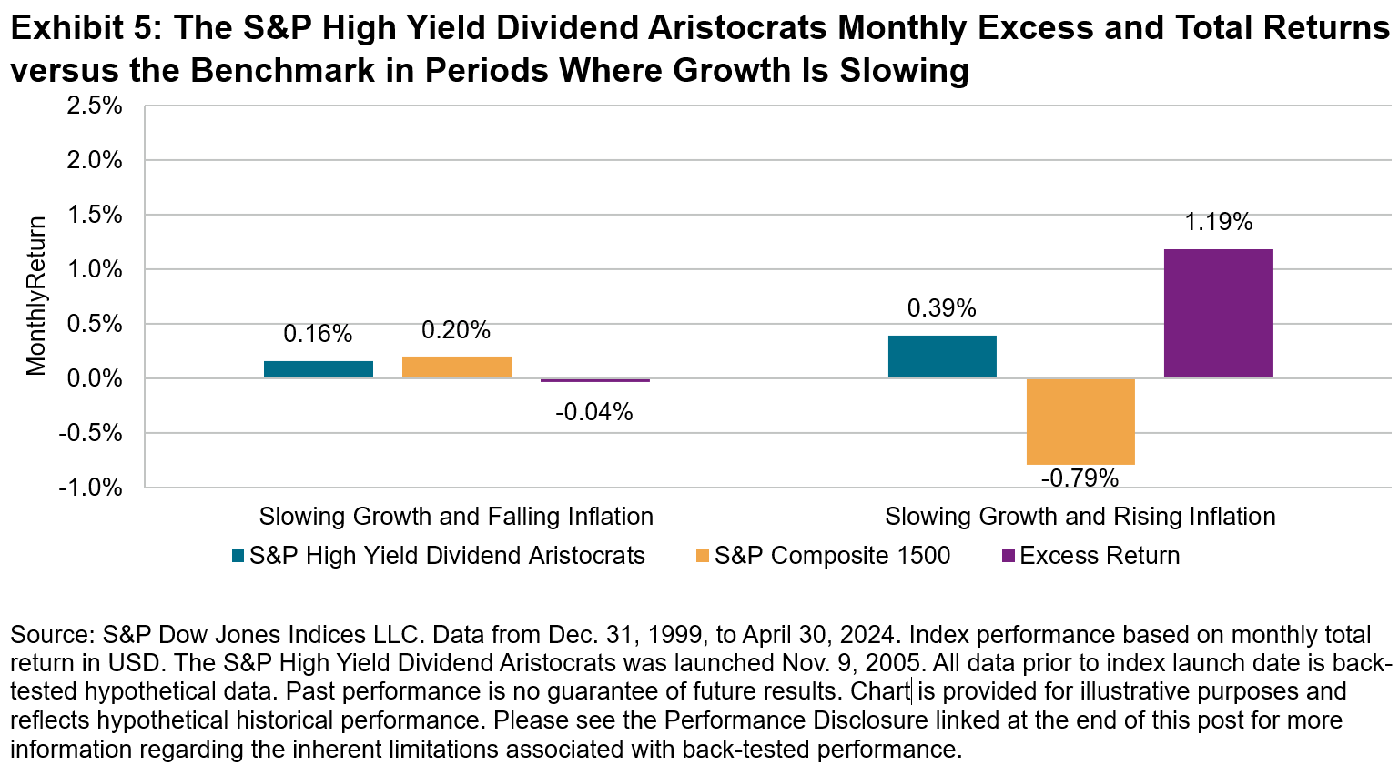 In a slowing growth but rising inflation backdrop, the S&P High Yield Dividend Aristocrats had a monthly average total return of 0.39%, which is around 120 bps of outperformance. Inflationary environments have historically tended to favor short-duration stocks such as Dividend Aristocrat companies. In slow growth periods where inflation is falling, the S&P High Yield Dividend Aristocrats’ performance has been in line with the benchmark.