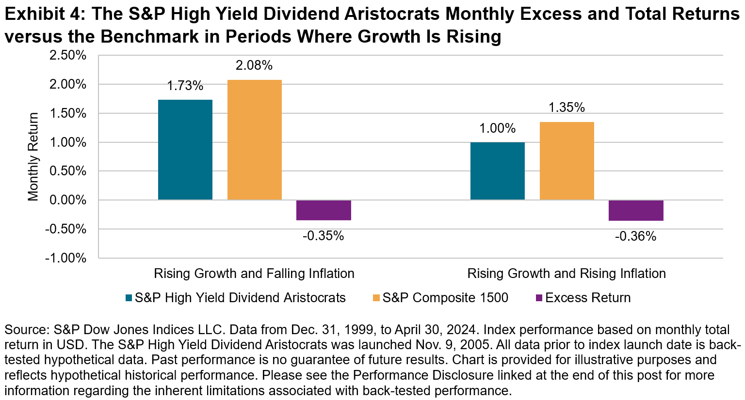 Periods of rising growth (as defined in Exhibit 1) have historically been in tandem with strong performance for equity markets (see Exhibit 4), with growth style stocks delivering outperformance. The “Goldilocks Zone”—the period of rising growth and falling inflation—is generally the period with highest excess returns versus the benchmark. However, dividend indices such as the S&P High Yield Dividend Aristocrats have a tilt toward value, and so there is a tendency for the index to underperform the benchmark in this environment. Regardless of the direction of inflationary pressure, in rising growth markets the average monthly S&P High Yield Dividend Aristocrats return has lagged the S&P Composite 1500 benchmark by 0.35%.