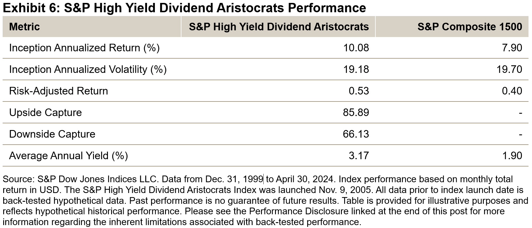 The S&P High Yield Dividend Aristocrats has historically provided stable consistent long-term dividend growth and robust performance, with enhanced dividend yields. The index has traditionally participated on the upside but has shown defensive positioning in falling markets due to lower volatility.