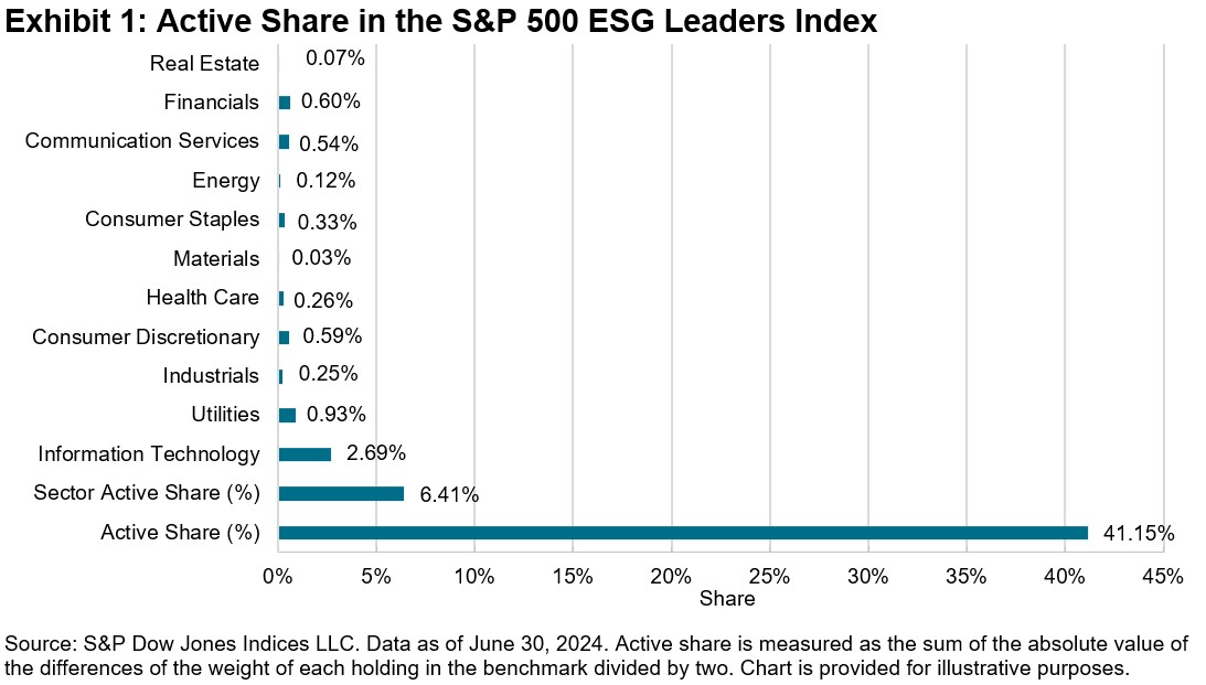 The S&P 500 ESG Leaders Index methodology selects constituents on a relative basis1 within each GICS® industry group, resulting in low active share within sectors. However, in certain instances, sectors may be over- or underweighted relative to the underlying index, causing deviation. This is illustrated by the active share at the index level reaching 41.15%, which is driven by both disparity in index constituents with the S&P 500, as mentioned previously, as well as weights (see Exhibit 1).