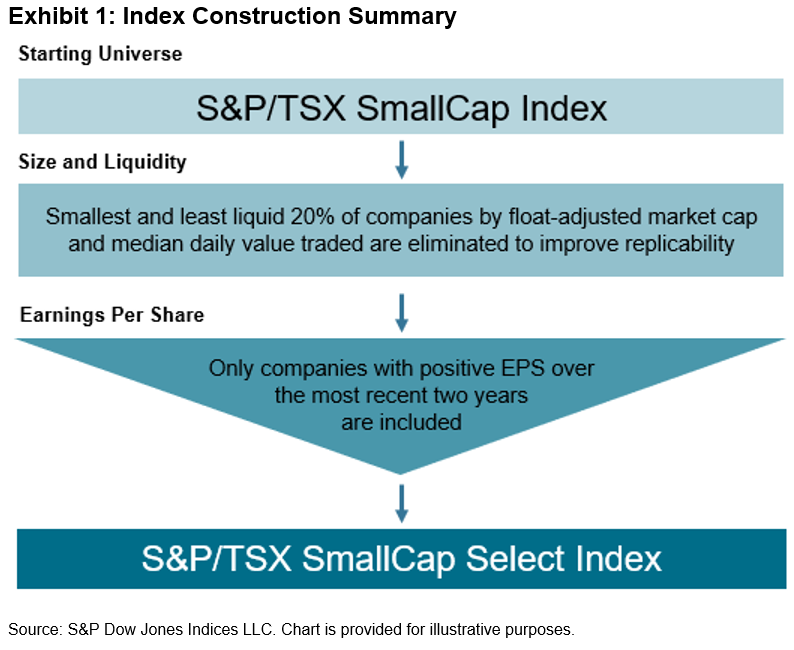 The S&P/TSX SmallCap Select Index employs the same methodological framework as our existing S&P Global SmallCap Select Index Series, but it utilizes the S&P/TSX SmallCap Index as its selection universe. To qualify for inclusion, companies must achieve two consecutive years of positive earnings per share. As a safeguard, companies that report two consecutive years of negative earnings are removed from the index. To enhance replicability, we also exclude the smallest 20% and the least liquid 20% of companies. The index is weighted by float market capitalization and is rebalanced semiannually in June and December.