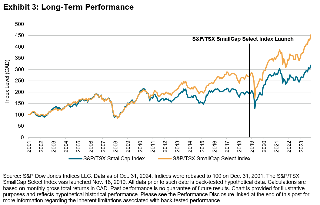 In conclusion, the S&P/TSX SmallCap Select Index demonstrates that a more targeted approach that excludes companies deemed less profitable along with the smallest and least liquid securities has historically improved long-term total returns, reduced risk and enhanced liquidity compared to the broader Canadian small-cap segment.