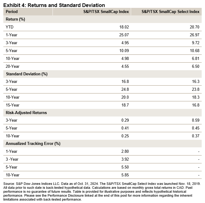 The S&P/TSX SmallCap Select Index has outperformed the benchmark during several periods, as shown in Exhibit 4. The index also experienced lower volatility, as reflected by its lower standard deviation, indicating more consistent returns and reduced exposure to the sharper price fluctuations that were seen in the broader S&P/TSX SmallCap Index.
