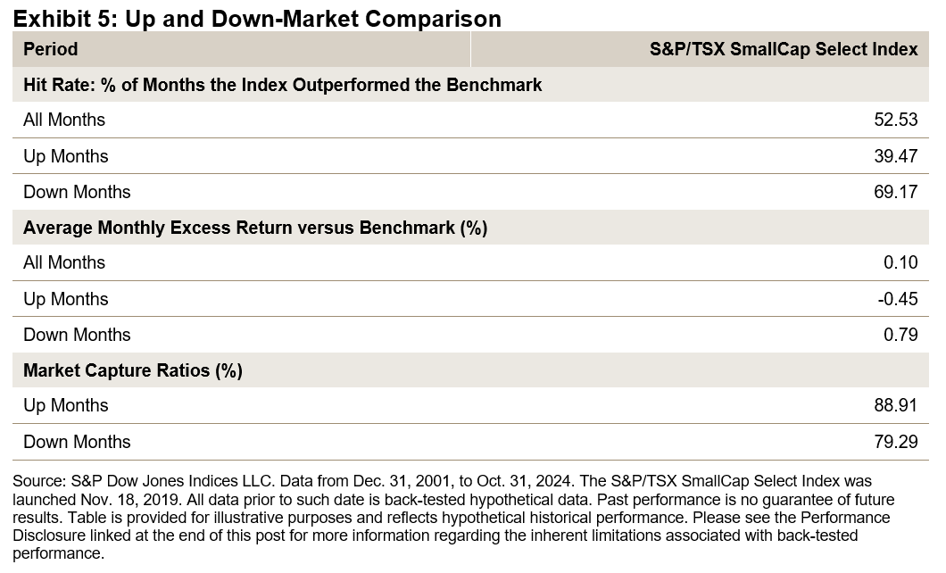 The S&P/TSX SmallCap Select Index has shown strong performance relative to the benchmark, with a hit rate of 69.2% during down months, suggesting its resilience in volatile markets. The lower down-market capture ratio indicates that the index was less affected by the market’s downside, providing additional stability during the market decline.
