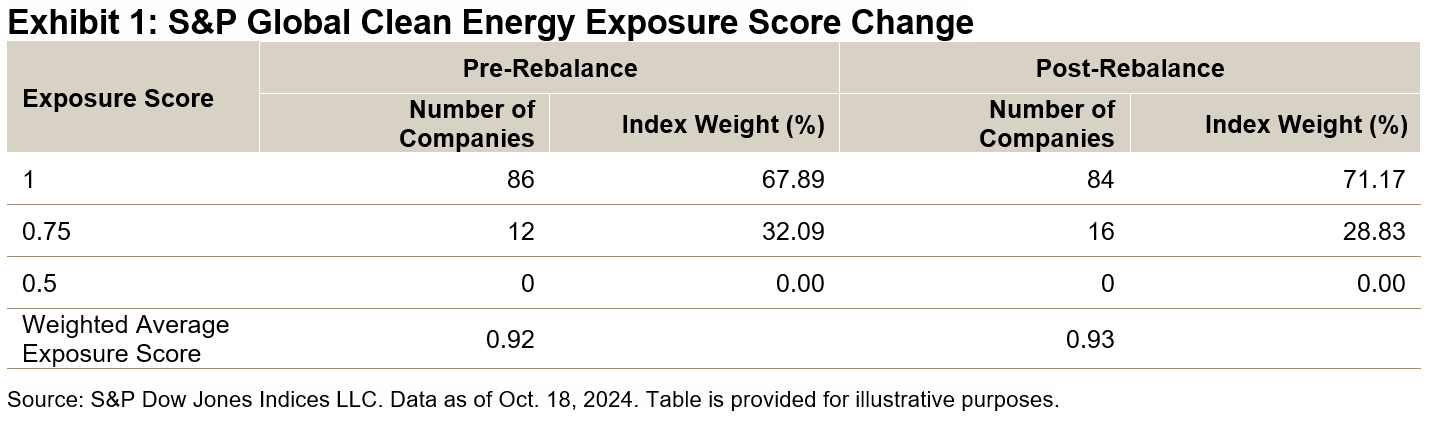 Both indices had their semiannual rebalances on Oct. 18, 2024. The index methodology categorizes companies into four exposure score buckets ranging from 0 to 1, with a 0.25 increment, to measure their clean energy business purity. Exhibits 1 and 2 show the change in exposure before and after the October rebalance for both indices. For the S&P Global Clean Energy Index, the weighted average exposure score of the index increased slightly from 0.92 to 0.93. The S&P Global Clean Energy Select Index consists of 30 companies with an exposure score of 1 listed in the developed market exchanges (see Exhibit 2).