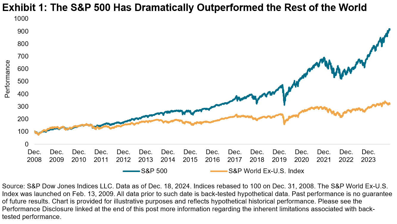 Exhibit 1 shows that U.S. outperformance is not a new phenomenon. The S&P 500 has significantly outperformed the rest of the world over the past fifteen years, with a cumulative return of 887% since Dec. 31, 2008, compared to an equivalent return of 320% for the S&P World Ex-U.S. Index.