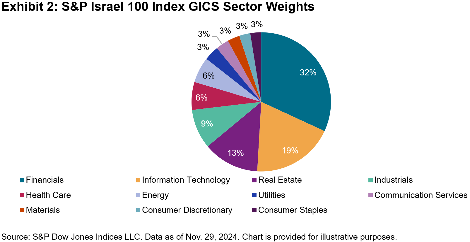 Launched in August 2023, the S&P Israel 100 Index is calculated in U.S. dollars and new Israeli shekels with more than 12 years of daily index level data available. The index includes all 11 GICS sectors, with Financials having the biggest market cap weight at 31.9%, followed by Information Technology (19.0%) and Real Estate (13.0%), as of the end of November 2024 (see Exhibit 2).
