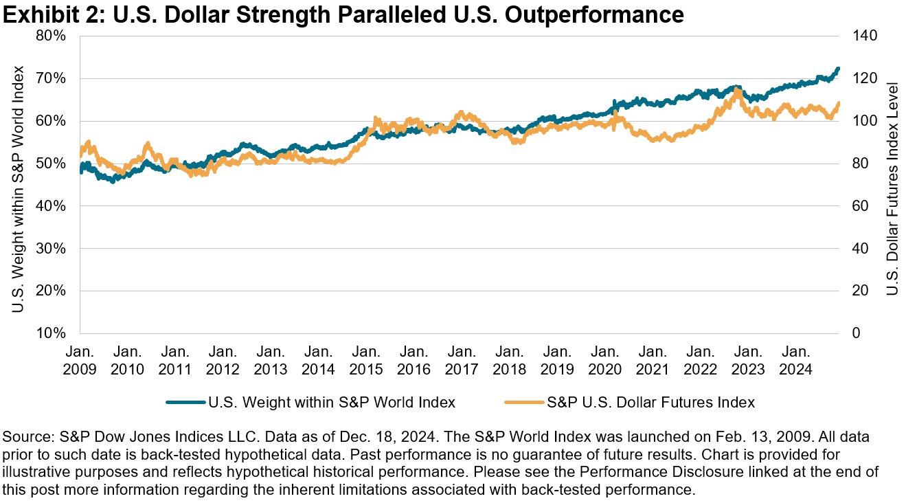 We’ve noted previously that concentration trends can manifest at a country level. As a result of its outperformance, the weight of the U.S. component of our S&P World Index has risen accordingly from roughly 50% in 2009 to over 70% currently. Meanwhile, the U.S. dollar has strengthened in tandem, as illustrated by Exhibit 2, which may create potential headwinds for large-cap multinational companies that tend to have more overseas revenue exposures and tailwinds for smaller, more domestically sensitive stocks.