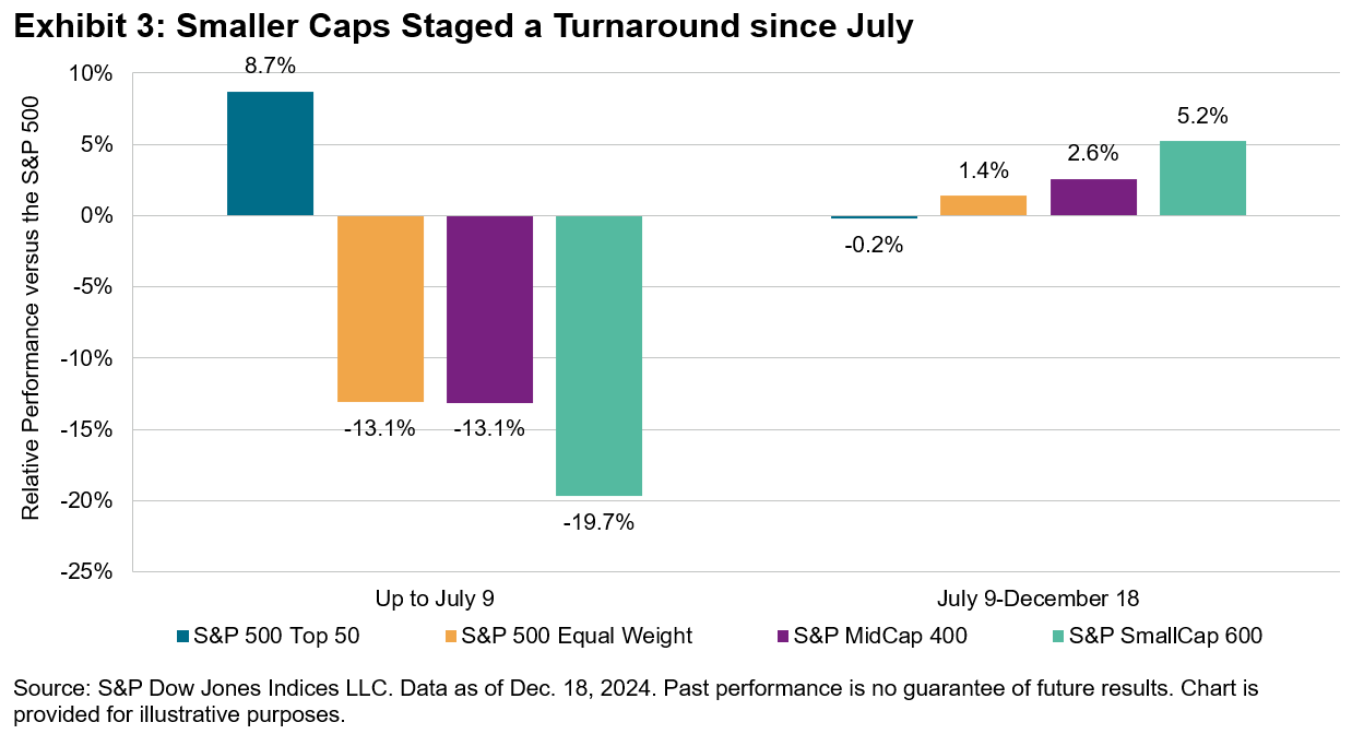 Turning our attention across the capitalization spectrum, the outperformance of U.S. equities broadened beyond large caps during the second half of the year, thanks to additional catalysts beyond dollar strength, including Fed rate cuts and post-election enthusiasm for potential impending tariff policies that may benefit smaller caps. Although mega caps have returned to favor so far in December, the S&P MidCap 400® and the S&P SmallCap 600® have outperformed the S&P 500 by 2.6% and 5.2%, respectively, since July 9, a key turning point for U.S. markets, as investors began to shift away from the Magnificent 7 and other mega caps toward smaller companies.