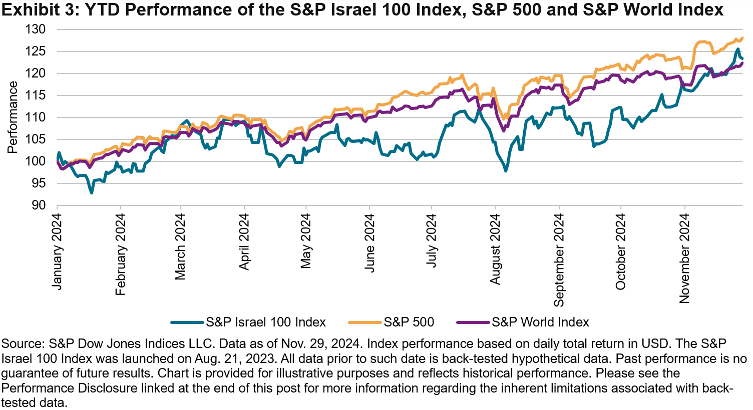 After a year of volatility and an accompanying modest annual return of 4.8% in 2023, 2024 YTD returns for the S&P Israel 100 Index have seen multiple all-time highs. Having returned 23.4% YTD (as of November 2024), the index has maintained a similarly positive trend as the S&P 500 (up 28.1% YTD) and the S&P World Index (up 22.4% YTD), as seen in Exhibit 3.