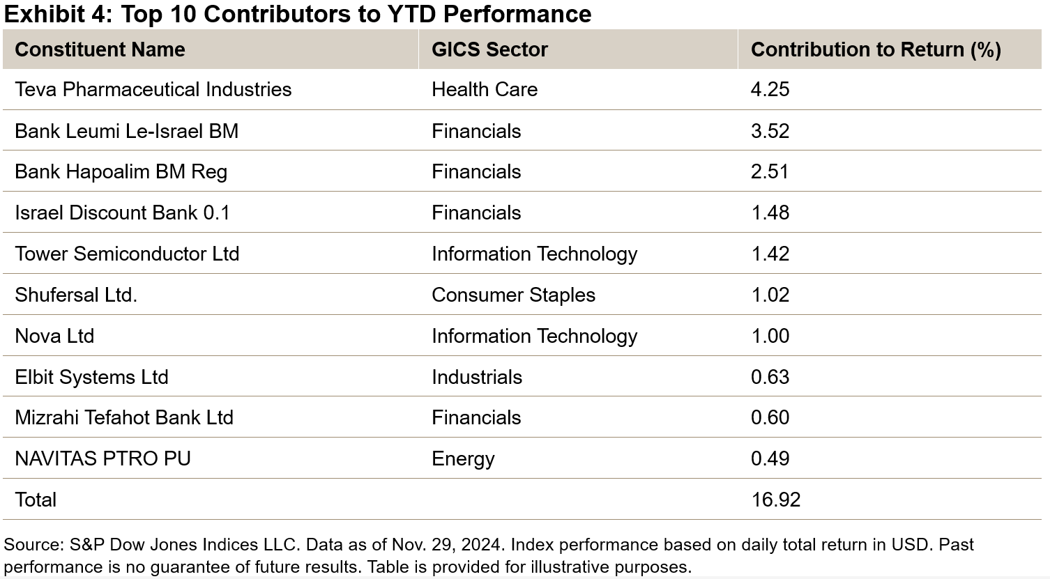 The main contributors to the YTD performance of the S&P Israel 100 Index vary across sectors, with Financials playing a significant role, along with Teva Pharmaceutical Industries from the Health Care sector, whose growth has been attributed to an increase in revenue from both their generic and branded drugs, as well as semiconductor manufacturers (Tower Semiconductor Ltd and Nova Ltd) from the Information Technology sector, which have been boosted by increased interest around the AI space. The top 10 contributors of the index accounted for 72.3% of its performance (see Exhibit 4).