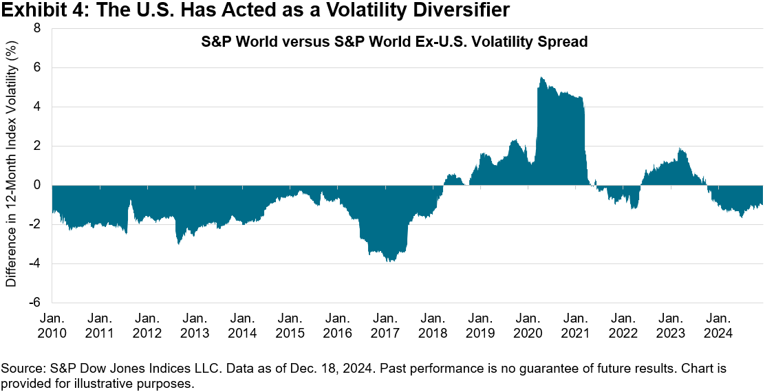 In addition to their stellar outperformance, U.S. equities are interesting to analyze for their diversification potential. In Exhibit 4, we calculate the spread in trailing 12-month volatility between the S&P World Index and S&P World Ex-U.S. Index. When this spread is positive, the inclusion of the U.S. increases volatility in the benchmark; when negative, the country acts as a diversifier. The negative spread that has occurred so far this year is an indication that the U.S. has become a volatility diversifier,1 consistent with the divergent performance observed earlier.