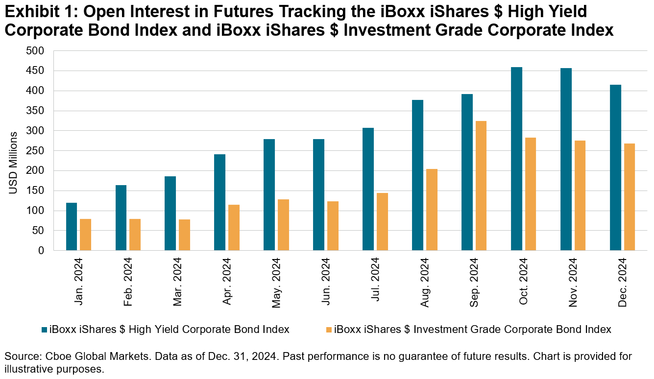 In 2024, open interest in futures tracking the iBoxx iShares $ High Yield Corporate Bond Index and iBoxx iShares $ Investment Grade Corporate Bond Index rose considerably. Open interest in futures referencing the iBoxx $ Liquid Emerging Markets Sovereigns & Sub-Sovereigns Index also increased following its June 17, 2024, launch.