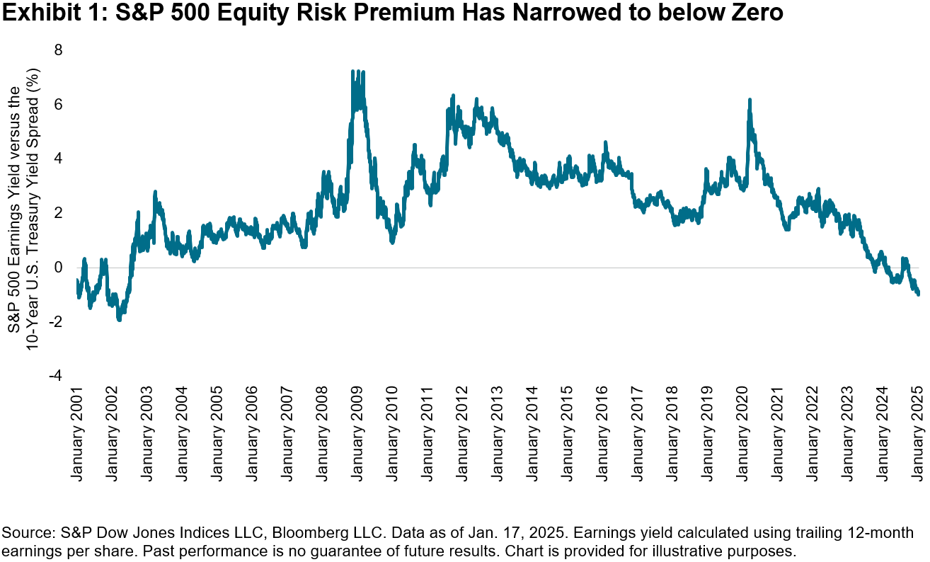 Coupled with rising yields and continuous record highs for the stock market, Exhibit 1 shows that the S&P 500® equity risk premium, measured here as the difference between the S&P 500 trailing 12-month earnings yield versus the 10-year U.S. Treasury yield, has plummeted over the past year, most recently entering negative territory. The last time the equity risk premium was below zero was following the burst of the Tech bubble during the early 2000s.