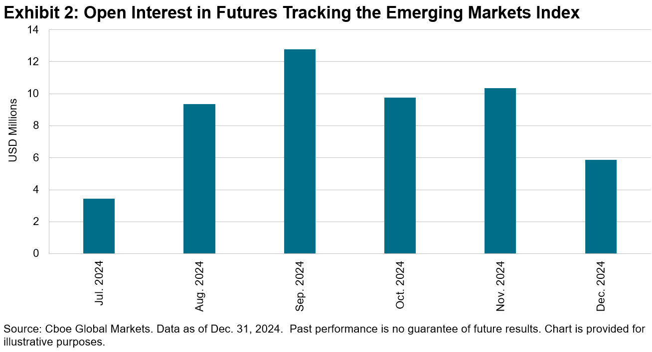 Futures tracking the iBoxx $ Liquid Emerging Markets Sovereigns & Sub-Sovereigns Index have traded USD 466.3 million in notional value since their June 17, 2024, launch. Average daily open interest initially rose from USD 3.5 million in July to a peak of USD 12.8 million in September, moderated to USD 9.8 million in October and USD 10.3 million in November, and ended the year at USD 5.9 million in December.
