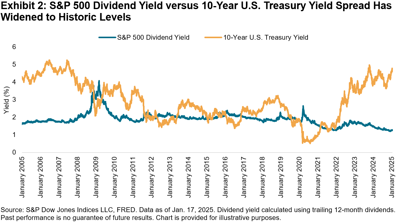 We can also analyze equities and bonds from an income lens by comparing the market’s dividend yield to 10-year U.S. Treasury yields. Exhibit 2 illustrates that the yield on the 10-year U.S. Treasury of 4.6% has significantly outpaced the S&P 500 trailing 12-month dividend yield, which has declined over the past couple of decades to 1.3% as of Jan. 17, 2025.