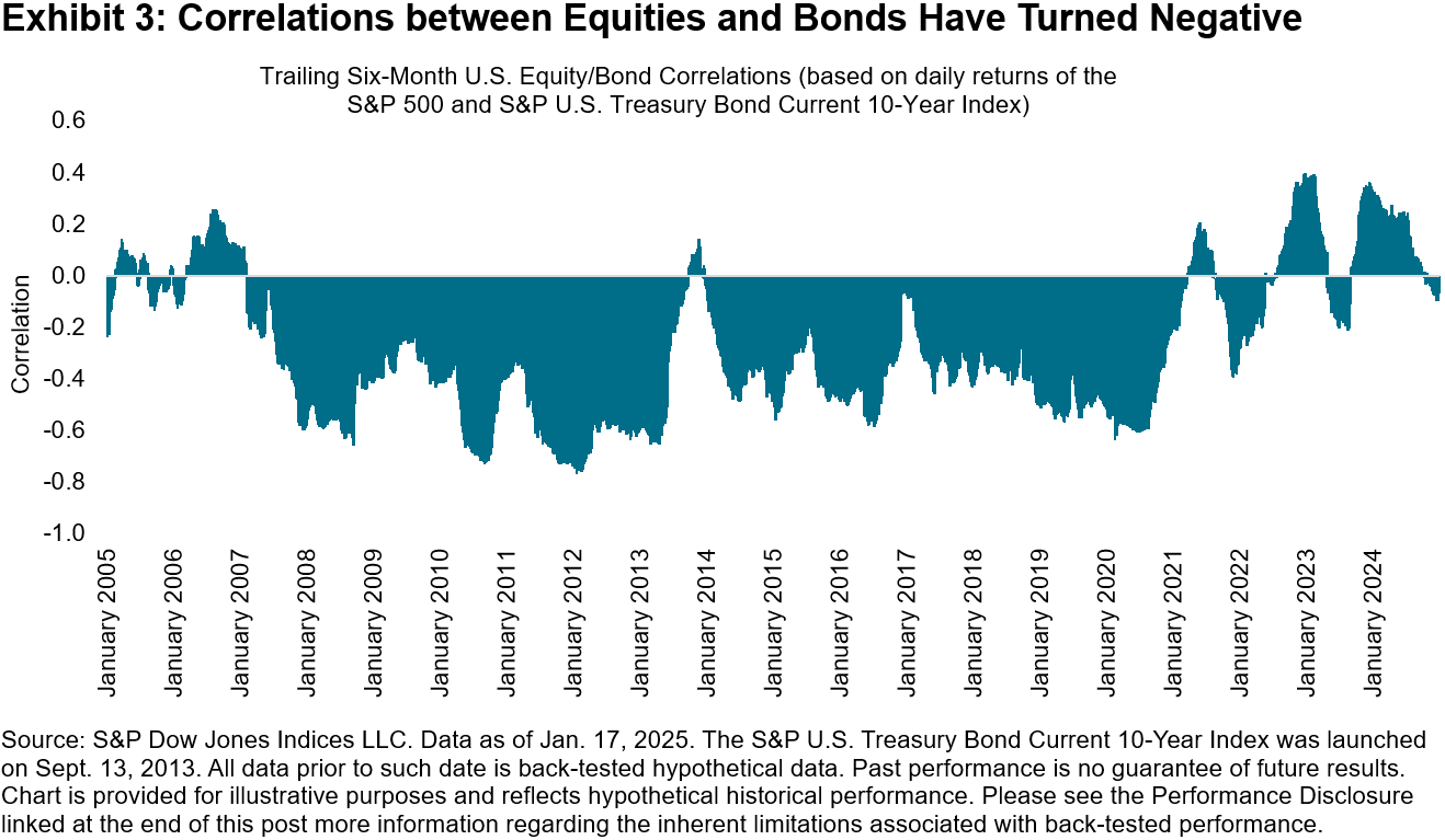 Bonds may seem relatively better positioned from a valuation and income vantage point, but their diversification potential is also interesting to examine. We observe in Exhibit 3 that correlations between equities and bonds, as measured by The 500™ and S&P U.S. Treasury Bond Current 10-Year Index, have recently turned negative. After witnessing positive correlations for most of 2024, this reversal, if sustained, might be indicative of a tailwind for enhanced risk-adjusted performance for combinations of both asset classes.