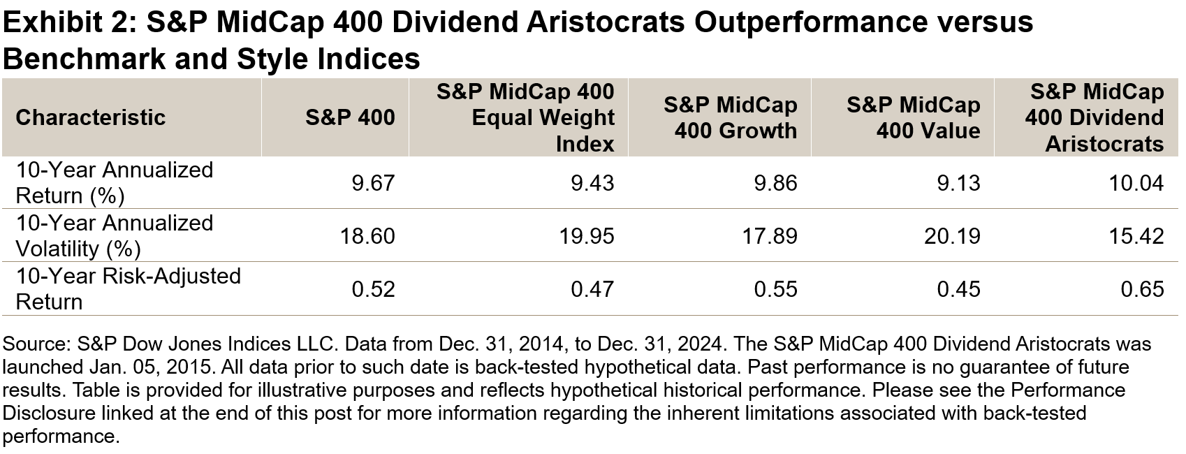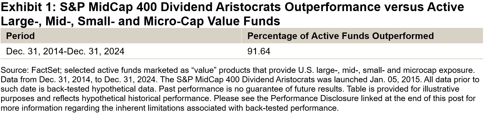 As Exhibit 1 shows, over the past decade, the S&P MidCap 400 Dividend Aristocrats outperformed 91.64% of active funds marketed as “value” products that provide U.S. large-, mid-, small- and micro-cap exposure, highlighting its long-term effectiveness versus active strategies in this category. This substantial outperformance ratio speaks to the strategy’s success relative to active managers while adhering to a straightforward yet rigorous methodology. What adds to the significance of this achievement is that the universe does not adjust for sales charges (such as front-end loads, deferred loads and redemption fees) that may be common within active strategies.