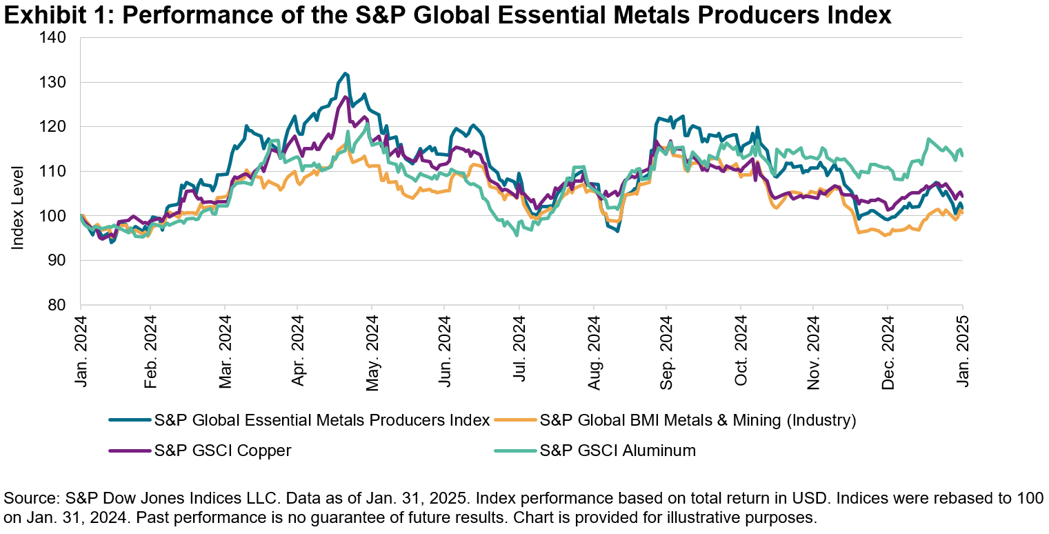 Since its launch in August 2023, the S&P Global Essential Metals Producers Index has underperformed the S&P Global BMI Metals & Mining (Industry) by 15.4%. However, more recently, the index’s performance showed signs of recovery, outperforming the S&P Global BMI Metals & Mining (Industry) in 2024. This positive shift aligned with the increasing performance of the S&P GSCI Copper and the S&P GSCI Aluminum, underscoring the surges in prices for these essential metals. Exhibit 1 summarizes this recent upward trend over the one-year period ending Jan. 31, 2025.