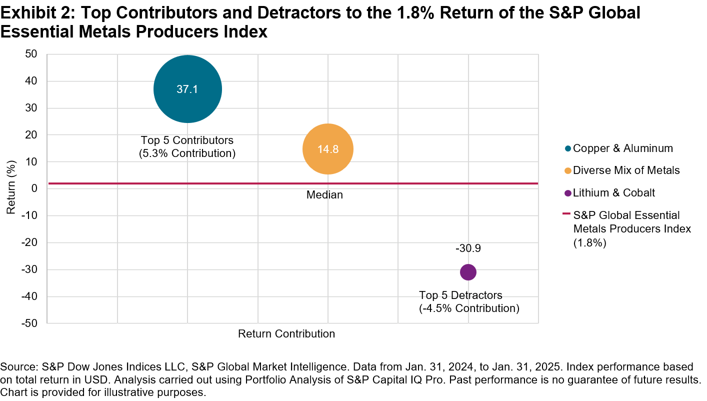 A closer examination reveals the impact of copper and aluminum producers on this recent outperformance, as these critical minerals form the backbone of the datacenters that are powering the skyrocketing demand for artificial intelligence.3 Exhibit 2 provides insights into the contributions to the 1.8% return of the S&P Global Essential Metals Producers Index, showcasing the average returns for the top five contributors and detractors among the index’s constituents. It also includes the average return for the five constituents closest to the median return contribution, for reference. The analysis categorizes these constituents based on their primary business products: copper & aluminum; a diverse mix of metals; and lithium & cobalt. The size of the circles indicates the magnitude of the positive contributions to the performance of the S&P Global Essential Metal Producers Index. A larger positive contribution results in a bigger circle, while a larger negative contribution is represented by a smaller circle.